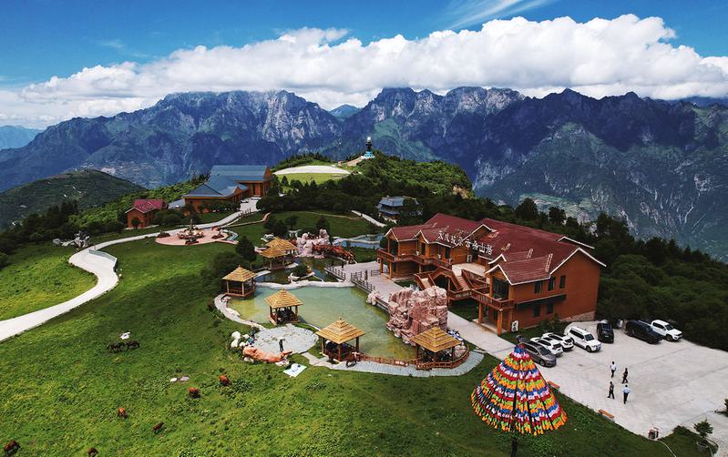 游客在舟曲拉尕山一处特色民宿外游览(7月12日摄,无人机照片)。